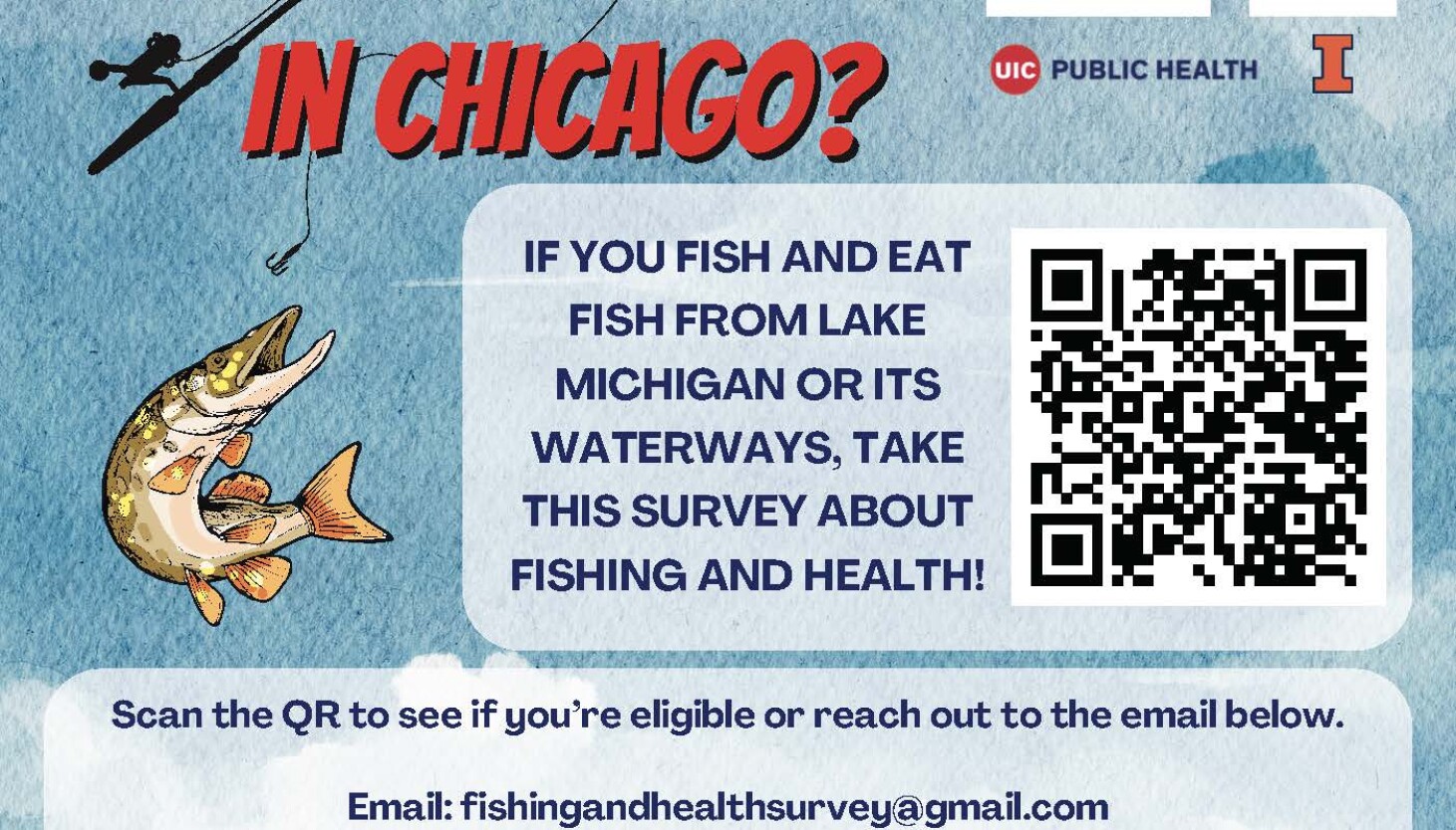 If you fish around Lake Michigan, take this survey about fishing and health! You can scan the QR code to take the screener now or reach out to our email fishingandhealthsurvey@gmail.com. The survey will take no longer than 30 minutes and $20 will be provided for your participation. Thank you!
